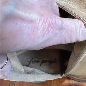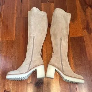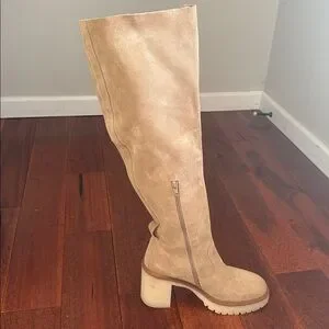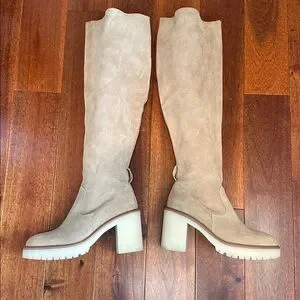 Chic over-the-knee boots by Free People in a soft cream suede. Stylish block heel. Please note minimal discoloration as shown in the last 2 pictures.