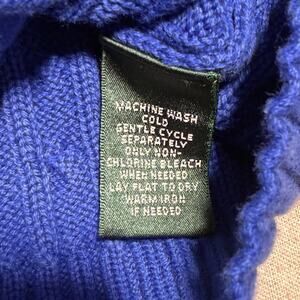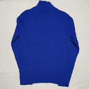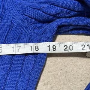The Lauren Ralph Lauren Cable Knit Full Zip Sweater in size L is a classic blue sweater made from cotton with cable-knit fabric. It features a mock neck and long sleeves, making it a stylish and comfortable option for women. The sweater also includes a full zipper, pockets, and subtle embroidered logo accents, adding a touch of sophistication to its timeless design. Measurements are listed below as well as in the photos.