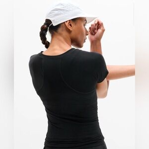 This sleek black t-shirt from Athleta features a fitted design with short sleeves, perfect for a modern and streamlined look. Its minimalist style and smooth fabric make it a versatile addition to any active wardrobe.