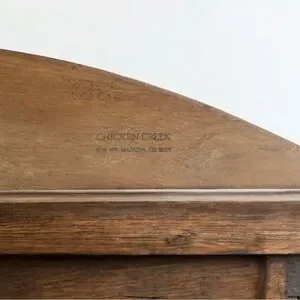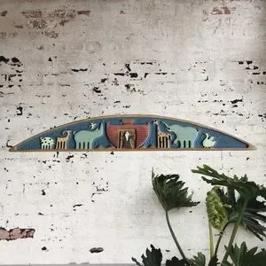 The vintage Chicken Creek Folk Art wood carved wall hanging or door topper featuring Noah's Ark is a beautifully handcrafted piece of rustic multicolor wood carving. Created by Chicken Creek Mancos, CO, this unique wall hanging depicts the biblical story of Noah's Ark in a charming folk art style. With its weathered painted finish, intricate carvings, and artistic flair this piece is ideal for hanging above a door frame, window, or mantel as a whimsical statement piece. It can also serve as a unique focal point in a wall gallery or entryway.