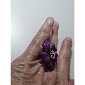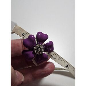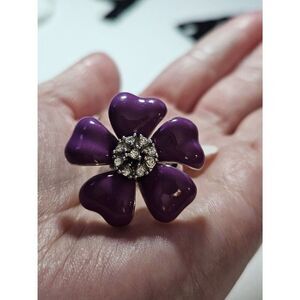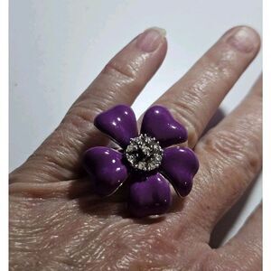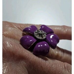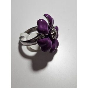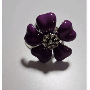 Silver Tone Purple Enamel Flower Ring Size 9 Cocktail Clear Rhinestone Accents