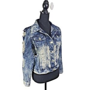DAZL Distressed Denim Jacket Womens Large Blue Acid Wash Shredded Y2K Punk