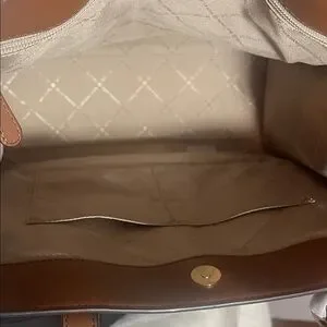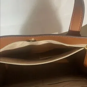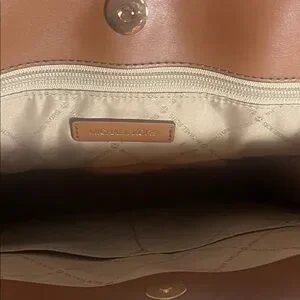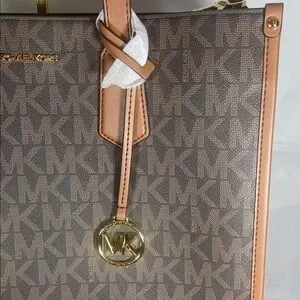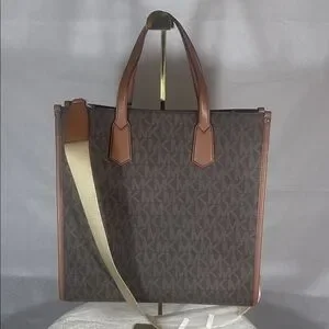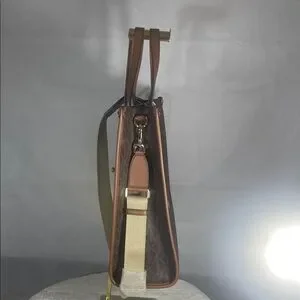 Stylish Michael Kors briefcase with iconic monogram design. Features dark brown leather trim. Perfect for work and travel. 3 pockets inside, one is Zipper pocket, 2 has open pockets,approx H : 14.1/2” , W : 14”, D :13.1/2”, Adjustable Strap .