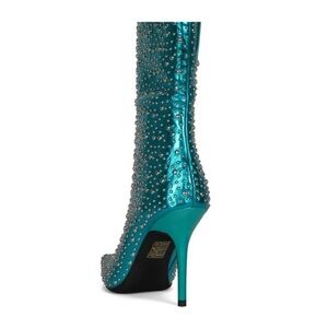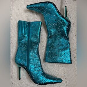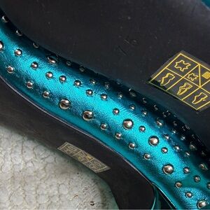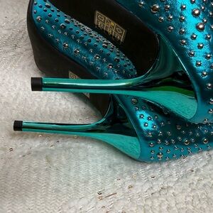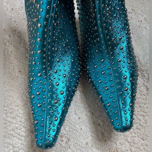 Boots are a metallic teal with different size silver studs placed throughout the boot. A pointed toe and sleek thin heel.
