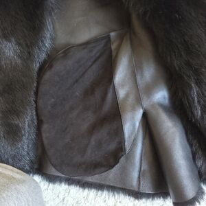 Side two: allover leather, shearling trims, panel construction with contrast trim