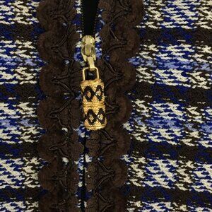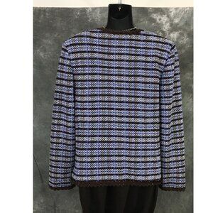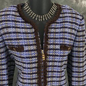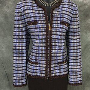 BEAUTIFUL St John collection knit blue brown multi jacket skirt suit size 8