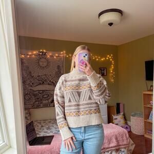 tags: marled, wool blend sweater, rustic print, mock neck sweater, size small, cozy sweater, fall fashion, winter style, marled brand, brown sweater, neutral aesthetic, soft knit