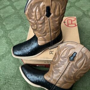 Step into classic Western style with these striking cowboy boots. The contrasting black and tan leather creates a visually appealing design, while the intricate stitching adds a touch of rugged elegance. The square toe provides comfort and a traditional cowboy silhouette. The sturdy construction ensures durability, making these boots suitable for riding, ranch work, or adding a Western flair to your everyday style.