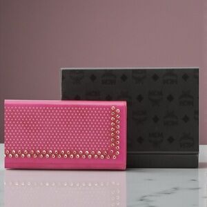 MCM Luxury wallet w Vibrant Pink Hue adorned and gold toned studs. Elegant MCM design.