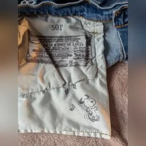 Classic Levi's denim 501 shorts with Peanuts Snoopy design. Light amount of fraying.