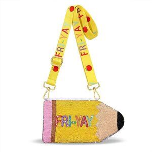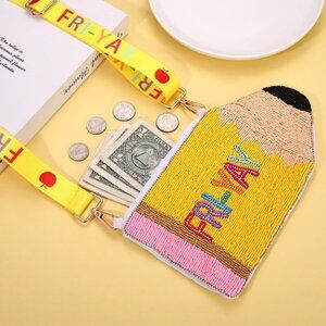 Features: Handcrafted beaded pencil-shaped crossbody purse with playful "FRI-YAY" rainbow lettering and a yellow pencil motif. Features reinforced stitching, a top zipper closure, and a detachable polyester strap, making it versatile to wear as a crossbody or shoulder bag. Compact enough to hold your essentials—phone, cards, keys, earbuds—while adding a pop of fun and color to your outfit.