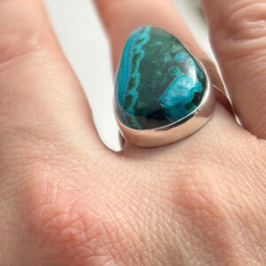 Sterling Silver 925 Malachite Chrysocolla Gemstone Ring Size 7 almost 7.25 Contemporary Boho Southwest Style Handmade New without tags. Includes packaging and organza bag. Custom designed in collaboration with a special artist providing better quality gemstones and settings made to last a lifetime. Tested and verified solid sterling silver 925 jewelry.