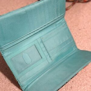 Size is approx. 4" x 8", and will hold a lot of items. It has a double magnetic closure, large zippered back misc./coin pocket, 3 large bill pockets, 11 card slip pockets, and an ID windows. This wallet will carry it all for that day or night out, or put it in your purse/tote/backpack, or handbag!