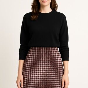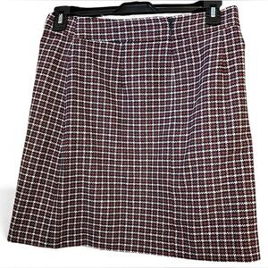 Classic and chic J.Crew wool-blend plaid A-line skirt in a rich burgundy, black, and white check pattern. Timeless style, perfect for fall and winter outfits, workwear, and holiday looks. Fully lined for comfort with a flattering silhouette.