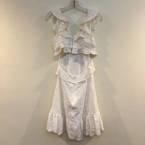 This gorgeous ruffled, eyelet dress from ASTR The Label has a cutout in the back, a zip up skirt, and a clasp closure on the top. Outer shell is 100% cotton, inner lining is 100% rayon. Preloved but in perfect condition with no flaws.