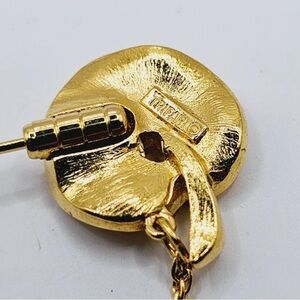Charming gold brooch with a frog and leaf design. Adds a playful touch to any ensemble