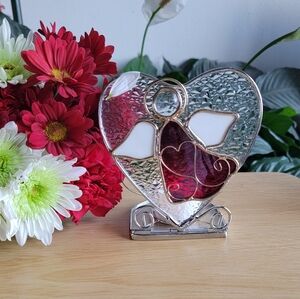 This exquisite heart-shaped stained glass tea light art features a stunning red and white angel design. A perfect piece to enhance your home decor with elegance.