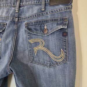 Additional details: signature "R" embroidery on pockets, button flap pockets, medium wash, mid-rise,