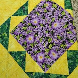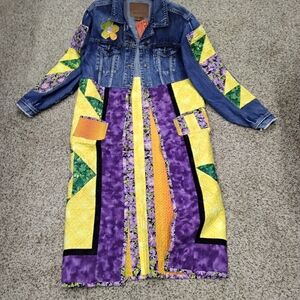 Vibrant patchwork design. Denim top with colorful purple and yellow patterns. Unique floral and geometric details.