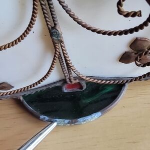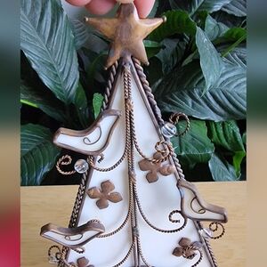 Decorative vintage stained glass metal Christmas tree with birds and a star. Features cream and brown colors. please see last pics as the metal base has some ware