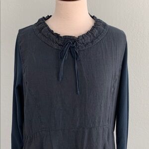 The Revere dress is a comfortable, artsy, and relaxed-fit garment made from 100% linen. It feature a unique combination of an all linen body and soft knit sleeves. This cool, crinkly dress features modern details and a worn-in look.