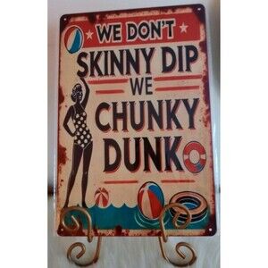 Humorous metal sign with the words: "We Don't Skinny Dip, We Chunky Dunk". Approx. 8" X 12". Great gift. For indoor or outdoor. Man cave or She shed. New in package.