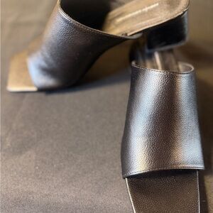 Step out in style with these sleek black leather mules. Perfect for any occasion, these shoes offer both comfort and elegance. Minor scuffs, great condition. 90s Fashion ❤️