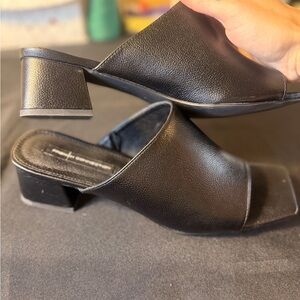 French Connection Y2K Black Square Toe Leather Women's Mules with Mini Heel