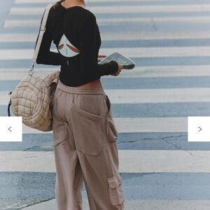 Free People Movement Buckle Down pants. Online now for $148. Stylish and comfortable womens tan cargo joggers with multiple pockets for convenience. Perfect for casual outings.