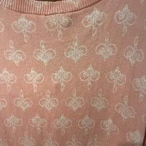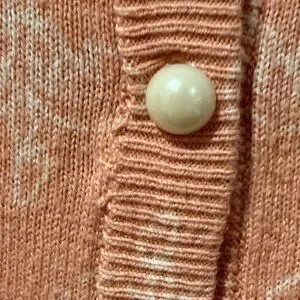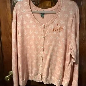 Worn only a couple of times. There is a slight imperfection due to a hole that was mended on the seam of the trim. Picture shown. Still wearable, barely visible. Charming pink cardigan with elegant pattern. Features button-up front and delicate embroidery.