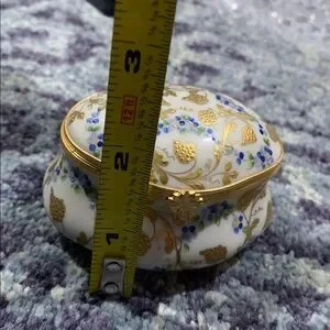 This elegant box has a gold tone metal hinged lid with a brass look rosette closure. Felt stickers added to bottom to protect from scratches. They may be removed.