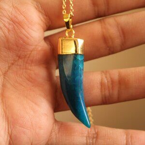 Stunning blue agate horn pendant wrapped in shiny gold trim. Eye-catching, vibrant, and perfect for adding a bold touch to any outfit. Unique cut and natural stone texture make it one-of-a-kind. Great for gifting or everyday style!
