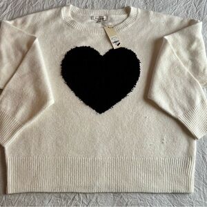 Stylish sweater with a bold black heart design. Soft and comfortable. Ideal for casual outings. New with tags. Slight pull in bottom of front right corner of sweater could be pulled through backside.