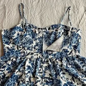 Elegant mini dress with floral pattern. Features blue and white hues. Perfect for casual wear.