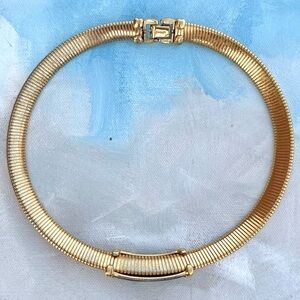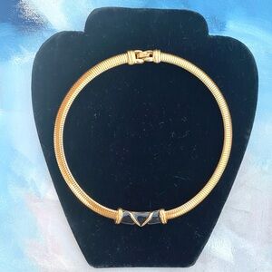 This is a beautiful and classic vintage Monet choker necklace. The piece features a shiny gold-tone serpentine or omega chain and a striking black enamel center with a bold "V" design. It closes with a secure lobster clasp. This style is highly sought after by collectors of vintage costume jewelry.