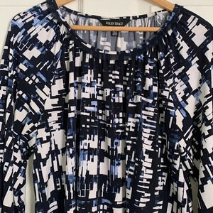 Navy, light blue and white patterned Tunic, 3/4 sleeves. Cute navy ruffle detail along neckline. Flattering roushing and flowy fabric. A generous size Medium.