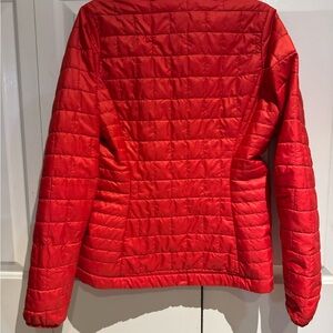 Bright red puffer jacket by Patagonia. Lightweight and cozy. Perfect for outdoor activities.