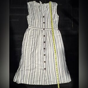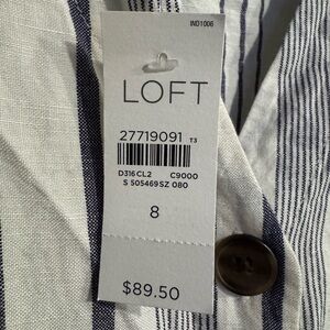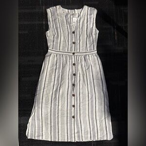 Stylish LOFT linen midi dress with navy and white stripes in size 8. Sleeveless dress with a button-down front. This dress has a flattering v-neckline, defined waist and has a pocket on each side. The tag is hanging off on one side and can be easily removed on the other if you wish. NWT.