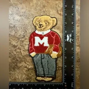 Charming bear patch. Red sweater with white 'M'. Gray pants. Perfect for customization.