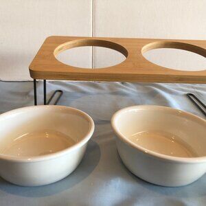 Elevated Cat Dog Pet Ceramic Food Bowls w Bamboo Stand 15 Degree Tilted #F11