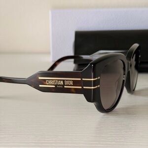 Stylish Dior sunglasses with a sleek black frame. Gold accents add a touch of elegance. Perfect for any fashion-forward look.