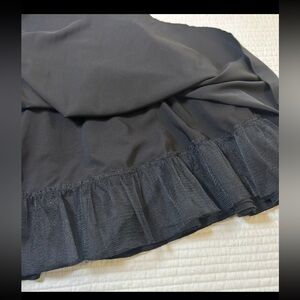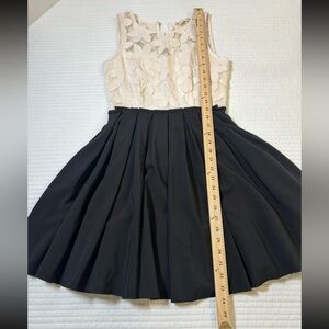 Elegant mini dress with a floral lace top. Features a flowing black skirt. Perfect for any occasion.