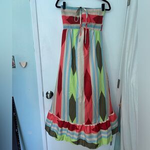 Geometric print, long dress strapless you could wear the tie around your neck or in a bow in front. Never worn perfect condition.