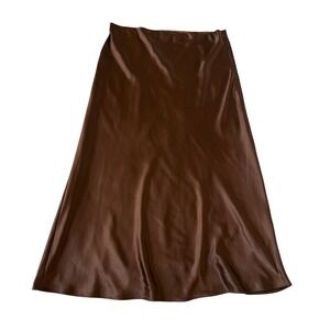 AQUA Satin Midi Slip Skirt - Exclusive for Bloomingdales - in Chocolate Brown, women's size XL (see measurements below). Beautiful, pull-on style, elasticized waist chocolate brown satin A-Line midi skirt, fully lined. Good pre-owned condition. See photos for details (one small pull and one smudge - should come out with next wash - not noticeable without detailed inspection).