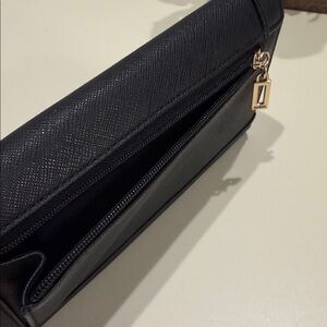 Chic Guess wallet in black. Features elegant gold logo. Perfect for everyday use. Height measurement is 4, width about 7 inches and Depth 0.98 inch thick.