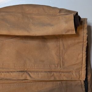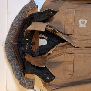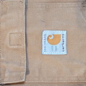 A pair of Vintage 1989 Carhartt 100 Year Anniversary CO196 Collared Duck Coat in men's size XLT (44 Chest). This coat was made by Carhartt back in 1989 in the USA in honor of their 100th Year Anniversary. It has Carhartt's classic duck cloth exterior in a nice tan color with sleek black quilted interior lining. It features quite large and tall front hand pockets and 2 velcro flap pockets. No interior pockets. There is an interior waist cinch string for a snug fit. Zipper and velcro closure with brown corduroy collar. This jacket also includes a removable Vintage made in USA arctic hood with quilted interior lining and faux fur ruff. This coat is in remarkable shape for it's age with no rips or frays. Only flaws are some tiny spots on sleeves and torso as pictured.