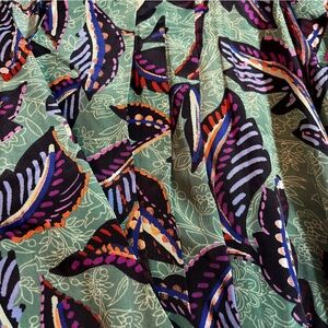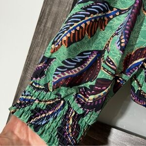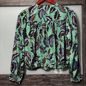 Elevate your style with this chic floral V-neck blouse. Featuring a vibrant green, blue and brown with metallic accent pattern, this top is perfect for any occasion. It has a crossover front and pleats, very flattering cut and bishop sleeves. Pair it with your favorite jeans or skirt for a complete look. Item is a women's PM; it is preowned and in excellent condition.