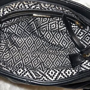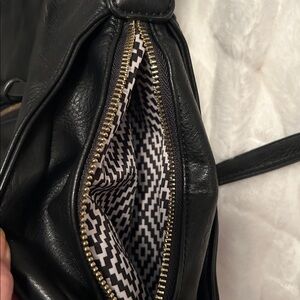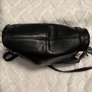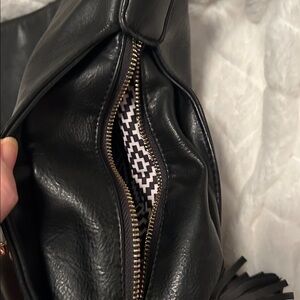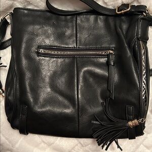 Elegant black crossbody bag with gold hardware. Features tassel details. Originally purchased for a conceal carry bag. Side tassels zip down to access from either side. Excellent condition!