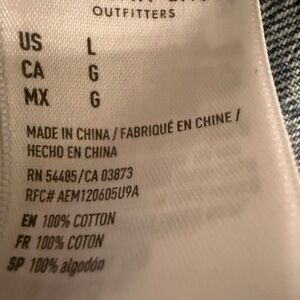 This American Eagle unisex Large distressed jean jacket is perfect for casual occasions during the colder seasons. Made from cotton denim in a classic blue color, it features a button front closure and long sleeves for added warmth. The regular fit and short length make it a versatile piece that can be styled for winter, fall, and spring. Easy to care for with machine washable instructions, this jacket from American Eagle Outfitters is a timeless wardrobe staple with a touch of edgy accents for both women and men.