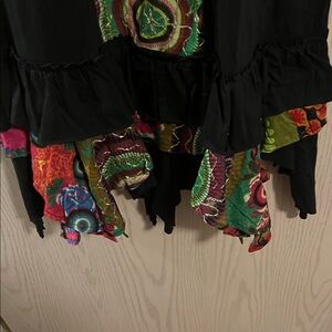 Chic black dress featuring vibrant multicolor patterns. Short sleeves and a playful hemline add flair. No size or material tag. Pls ask for measurements
